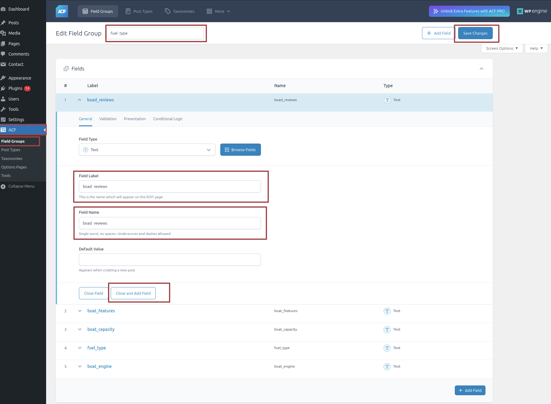 Get started by Start the Dashboard--->ACF -->Field Groups--->Close and Add Field .