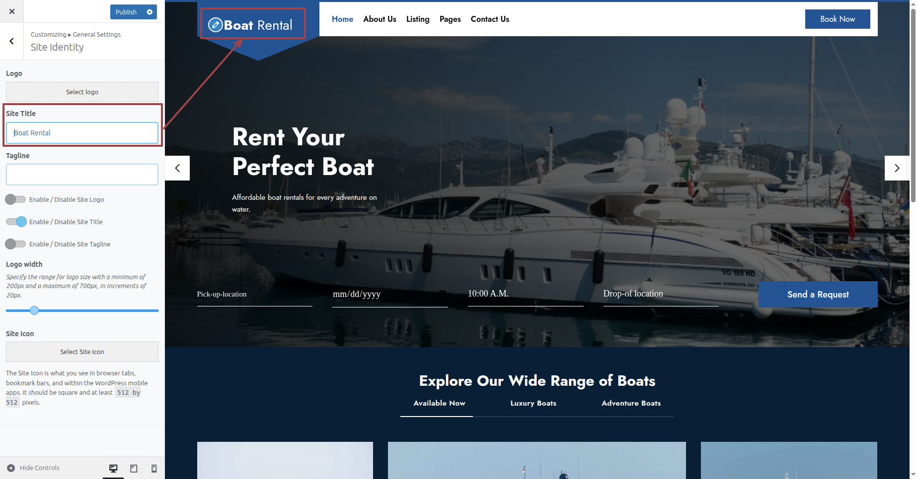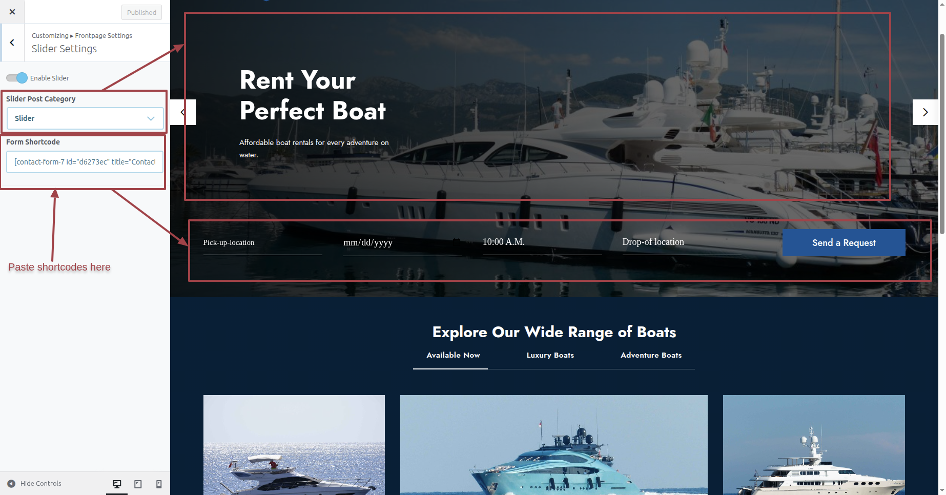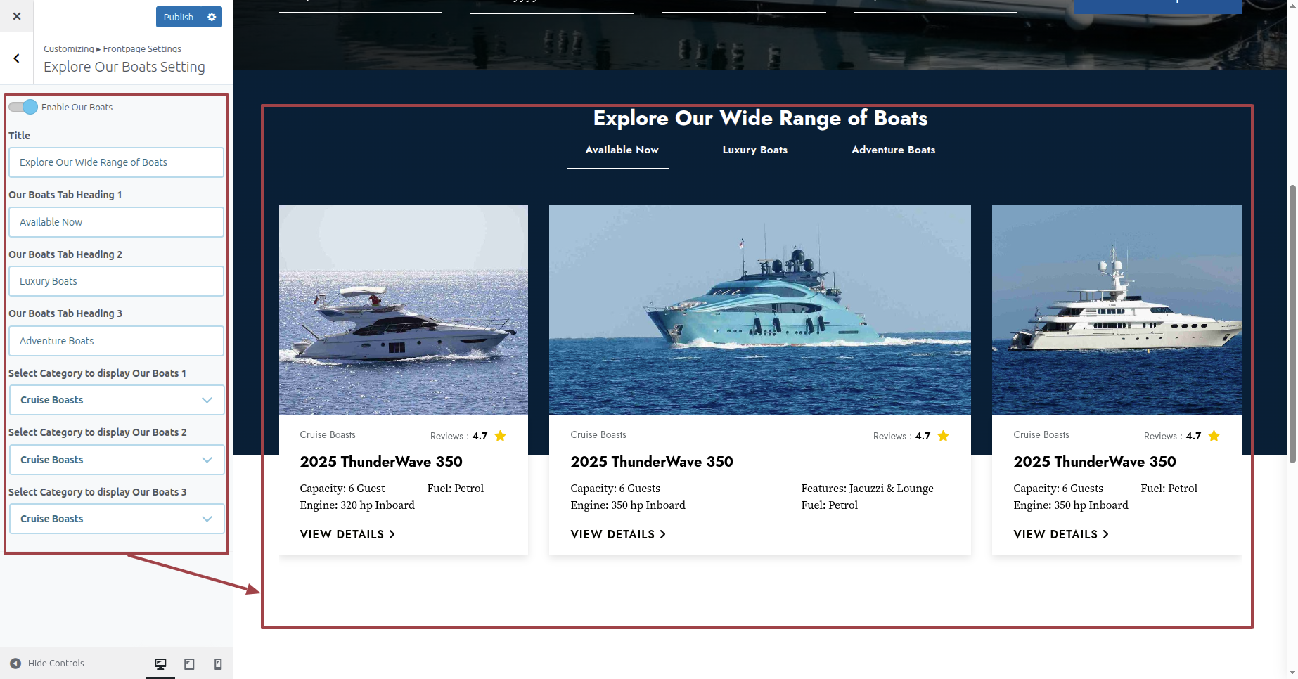 Get started by Start the Appearance--->Customize --> Frontpage Settings--->Explore Our Boats Settings .