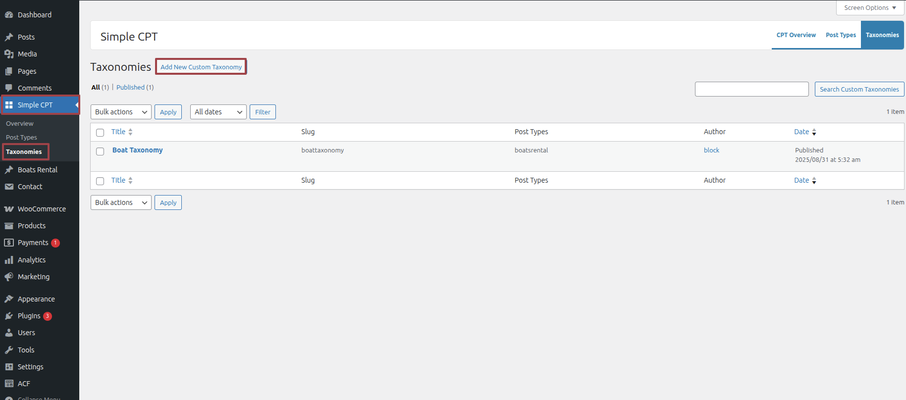 Get started by Start the Dashboard--->Simple CPT -->Taxonomies--->Add New Custom Taxonomy .