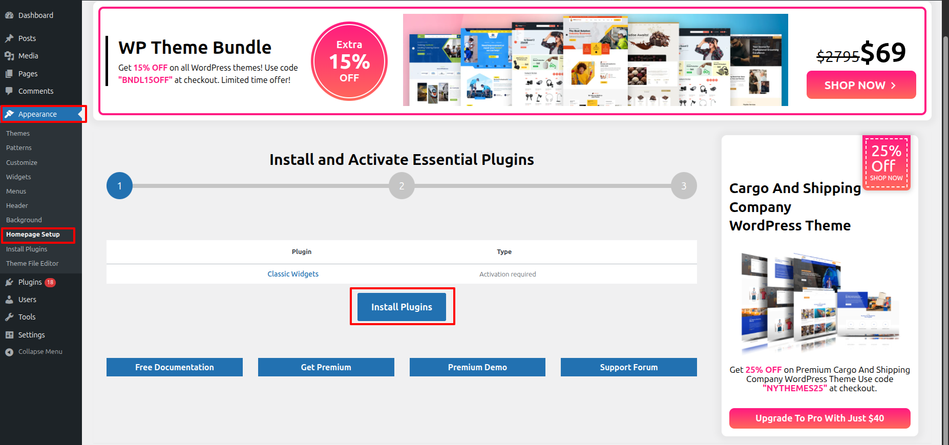 Access the Homepage Setup by Start the Dashbord---> Appearance -->Homepage Setup---> an click on Install Plugins.