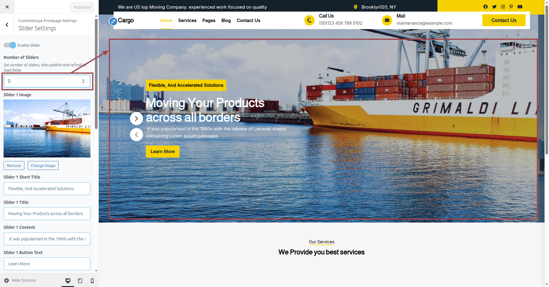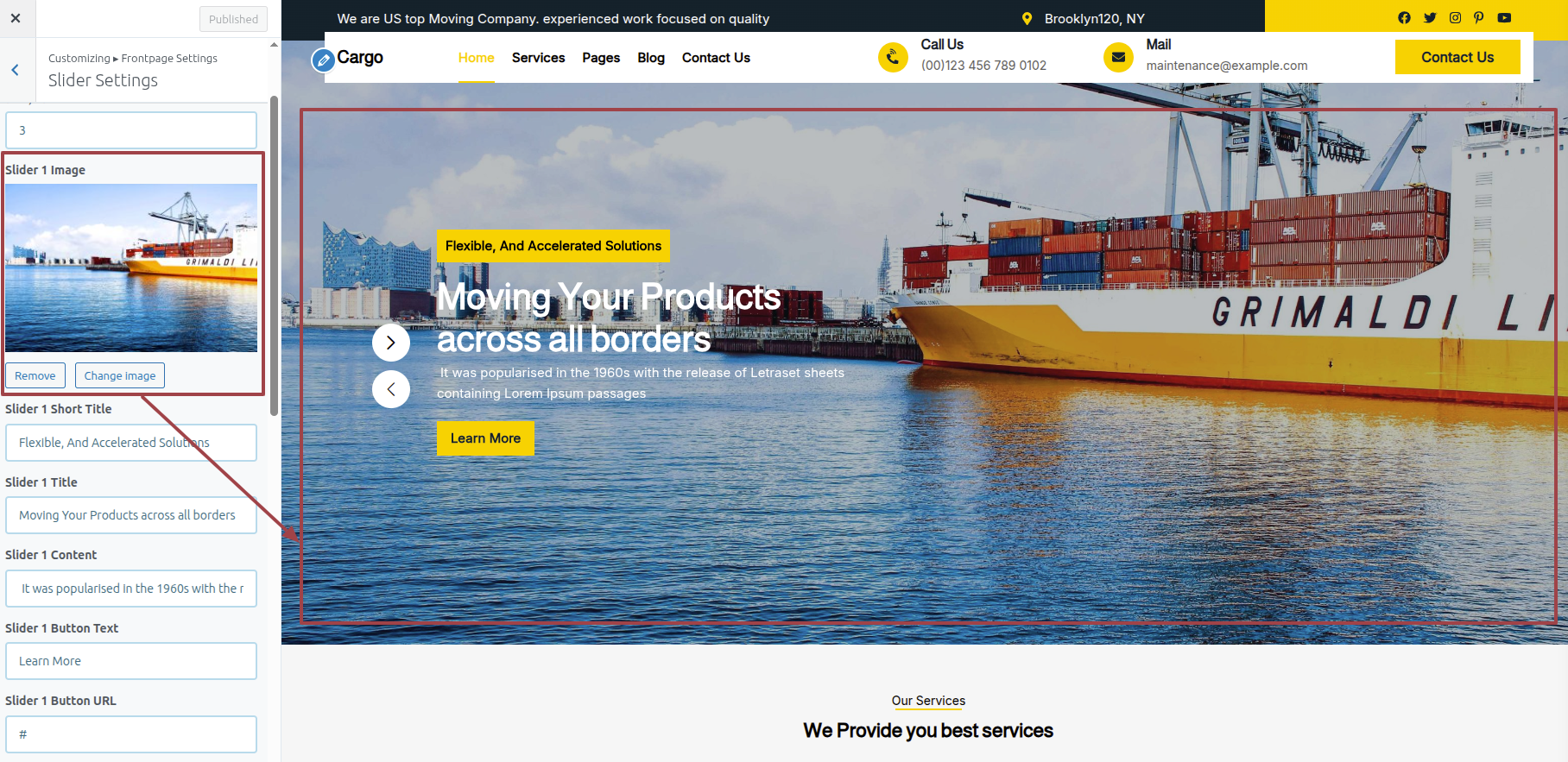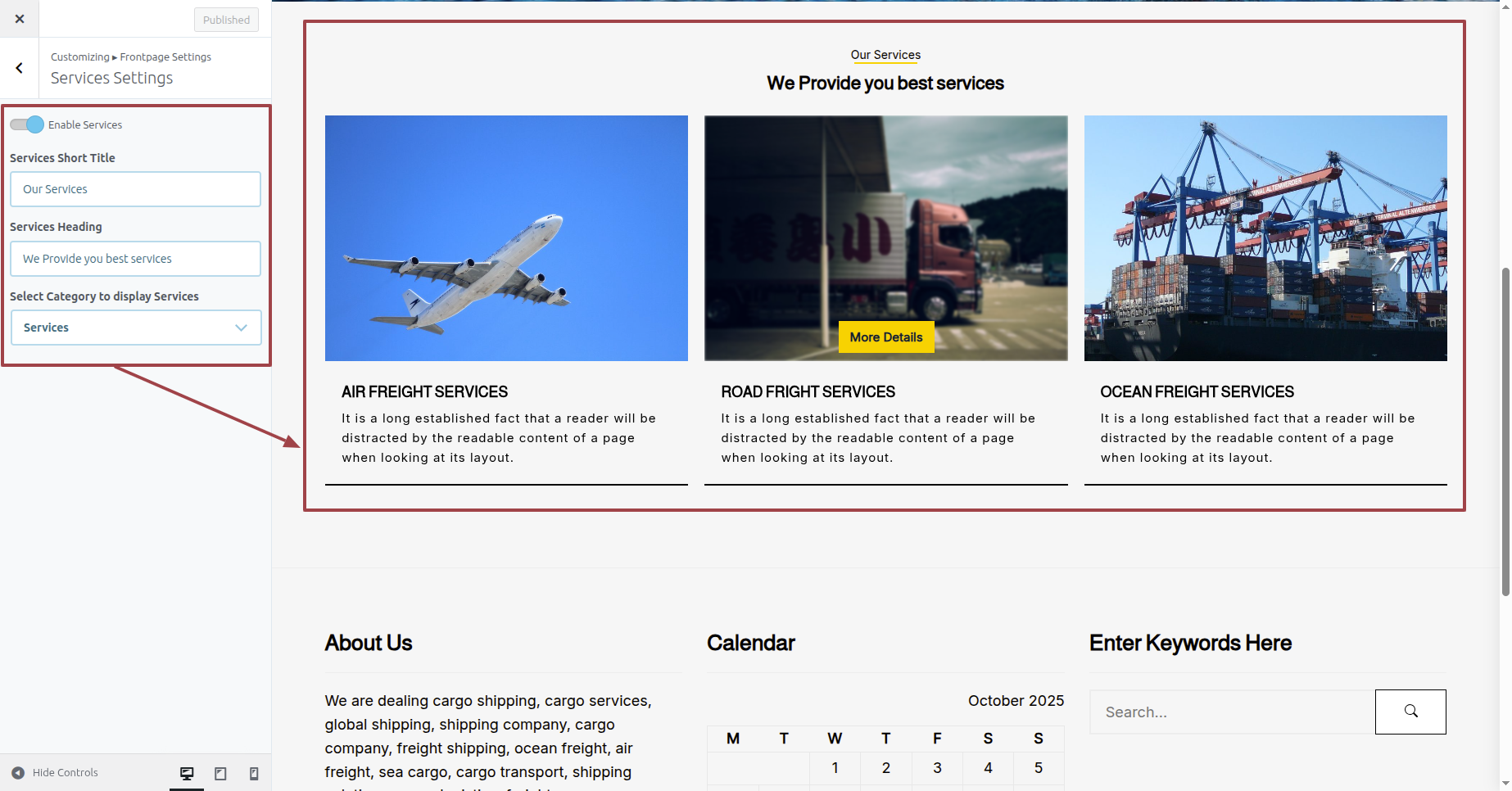 Get started by Start the Appearance--->Customize --> Frontpage Settings--->Services Settings .