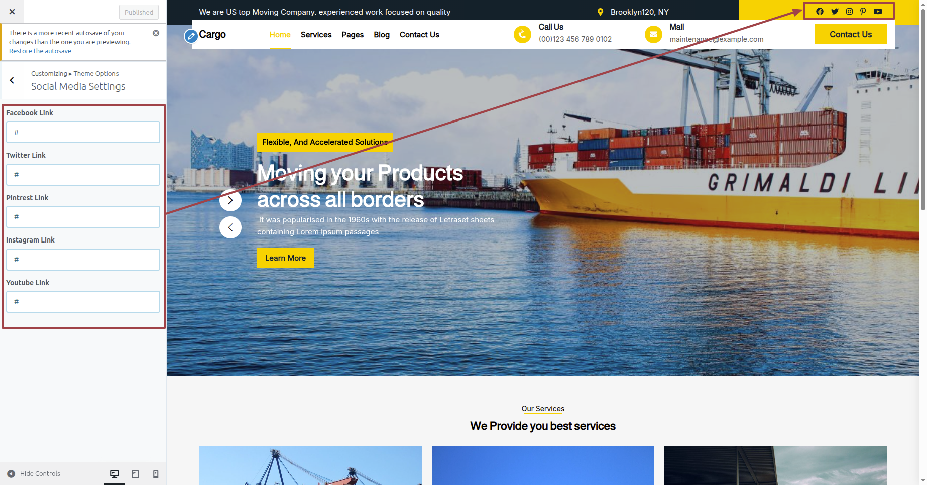 Select Appearance---> Customize -->Theme Options--> Social Media Settings.
