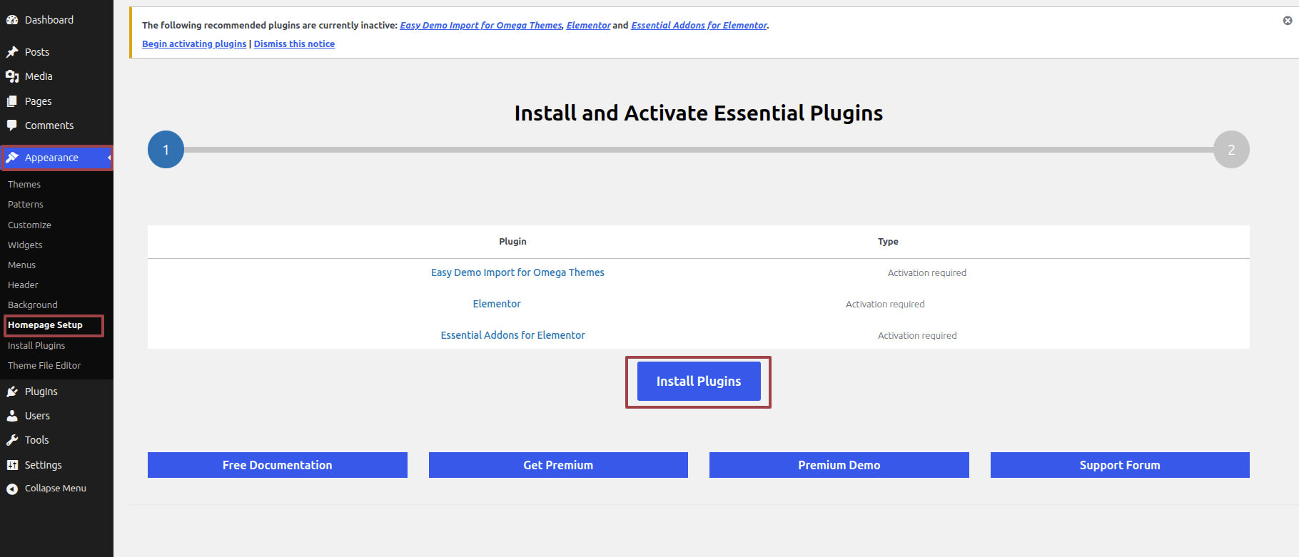 Access the Homepage Setup by Start the Dashbord---> Appearance -->Homepage Setup---> an click on Install Plugins.