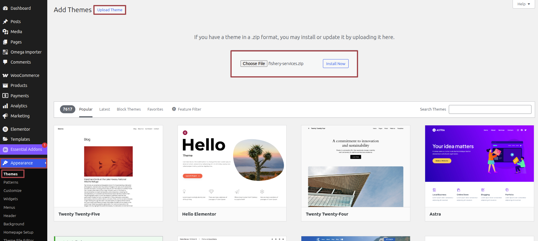 4. Select your fishery-services.zip theme through choice of the Browse button, then click the Install Now button.