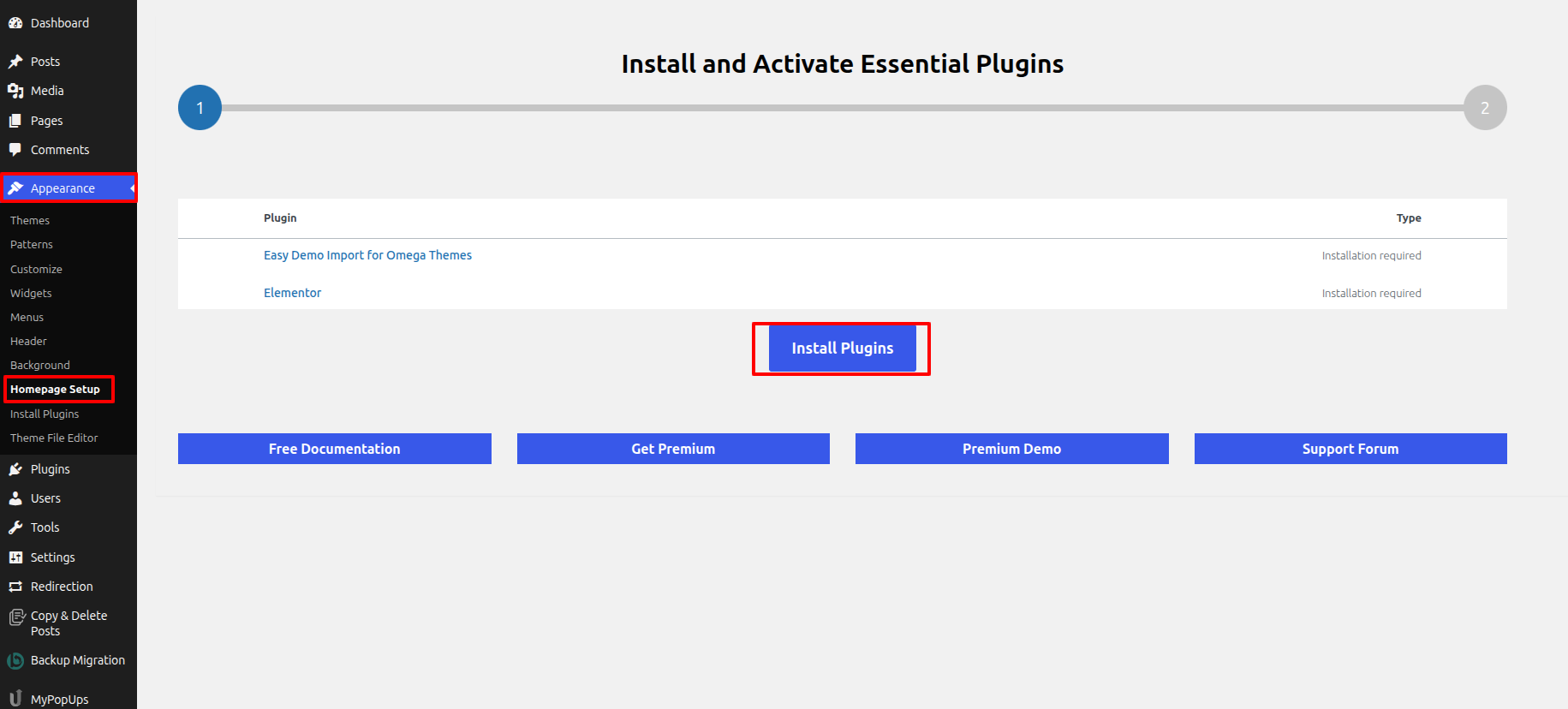 Access the Homepage Setup by Start the Dashbord---> Appearance -->Homepage Setup---> an click on Install Plugins.