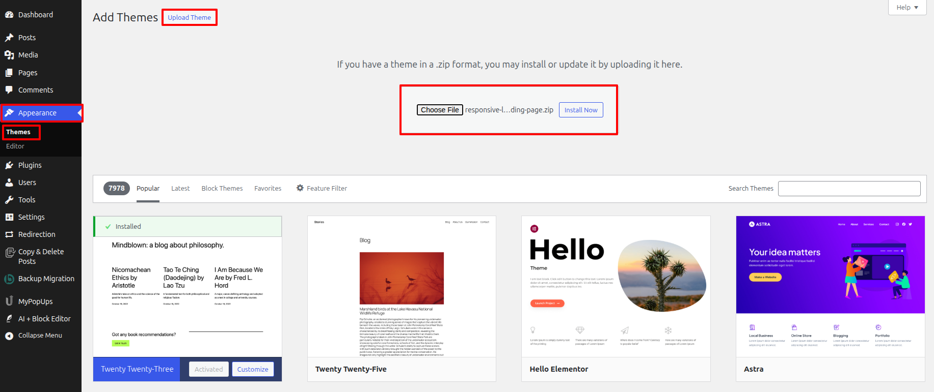 4. Select your responsive-landing-page.zip theme through choice of the Browse button, then click the Install Now button.